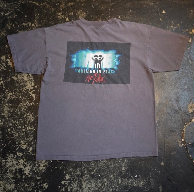 No RulesでMIBパロディプリント しっかりアメリカ製でサイズバランス良いLサイズ アメリカ製 裾袖共にダブルステッチ サイズ表記L(肩幅55cm 身幅55cm 着丈66cm) 写真4枚目のように日焼けムラあります 写真7枚目のように正面左裾あたりに汚れあります 神経質な方はご遠慮ください