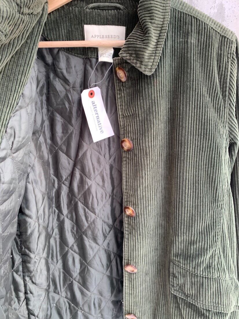 深い緑の太畝コーデュロイでボタンや袖口がとてもかわいい