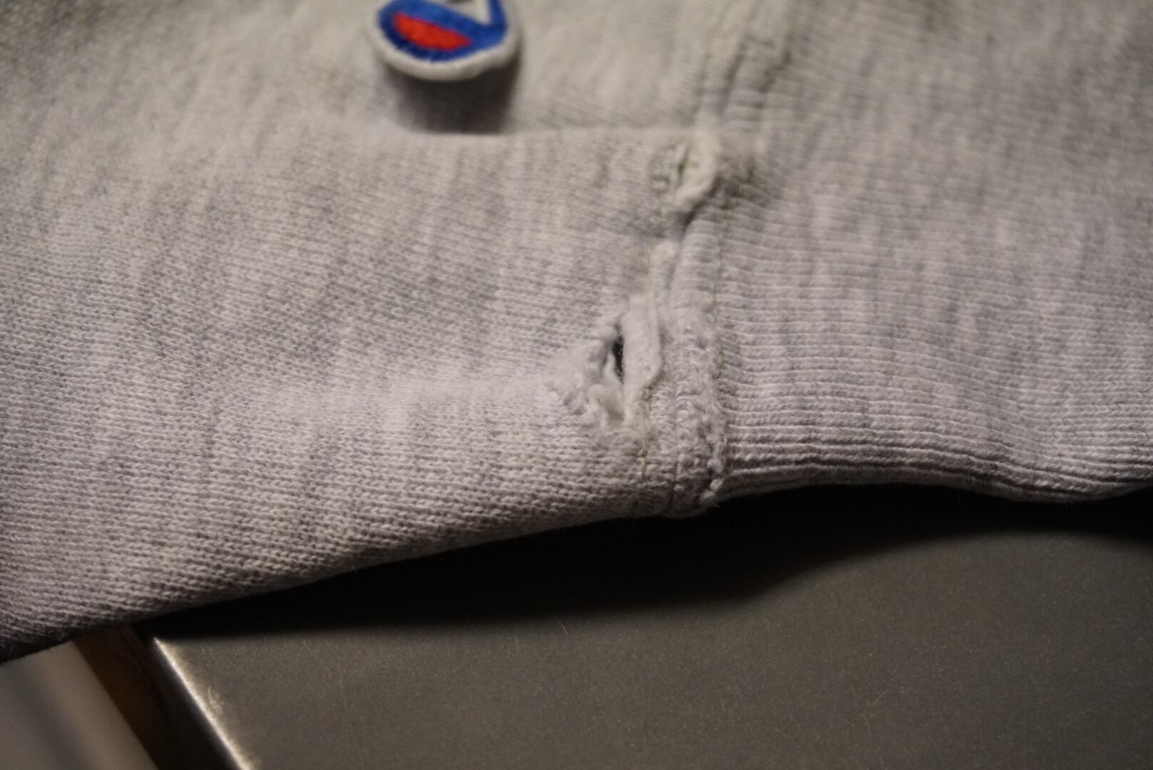 右腕に写真4枚目のような汚れ、8枚目のように袖のチャンピオンのロゴが取れかけてます