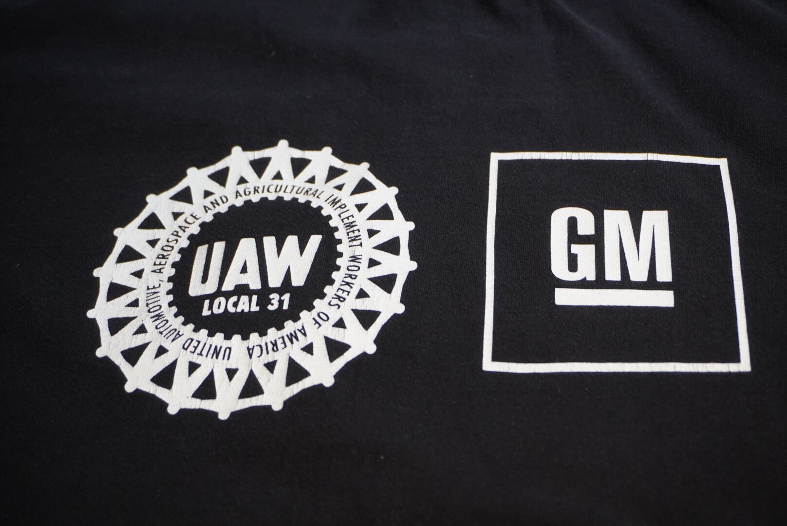 正面に車のクラシックなプリント、バックには全米自動車労組のUAWとGMエンジンのロゴが入ります